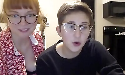 Redhead glasses wearing nerd got lucky as she fucks with a fake boobs milf